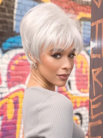 Samy by Rene of Paris is a sleek and chic modern pixie cut hairstyle. This wig has a tapered nape and sides as well as long brow grazing fringe to frame the face