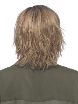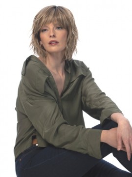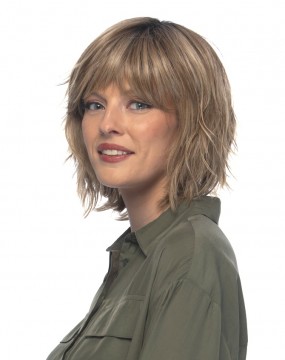 This is Hollis Wig by Estetica. Machine Made with a mono top. A stylish easy to wear choppy layered style with texturized waves and wispy bangs. Effortlessly stylish, just pop it on and go! Our recommendation for styling Heat Friendly fiber is to stay between 275° F-300° F for best results. Similar to the popular Jones but with a mono top and heat defiant fiber.