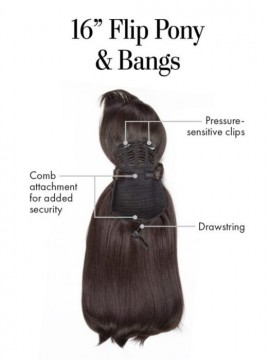 Everything old is new again! The retro flip pony is back and better than ever now that paired with sassy side-swept bangs. Two pressure-sensitive clips secure the bang and two 5-prong combs secure the pony so you can jive, bob and pony with confidence!