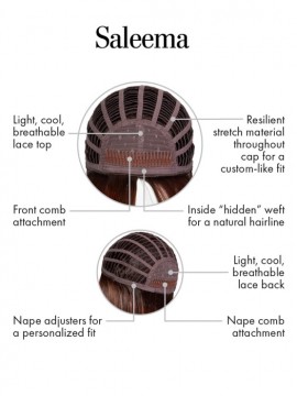 Saleema by Kim Kimble. Your new go-to for a quick style switch. Just pop this ¾ wig on behind your front hairline and secure with the stretch combs. Choppy layers of flat-ironed natural texture can be worn loose, paired with a cute headband or pulled back into a ponytail.