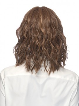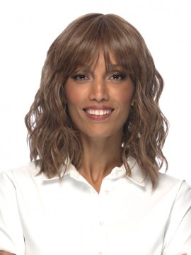 This is Frankie Wig by Estetica. Machine Made with a mono crown. A gorgeous mid length style with wispy bangs and loose waves. Effortlessly stylish, just pop it on and go! Our recommendation for styling Heat Friendly fiber is to stay between 275° F-300° F for best results.