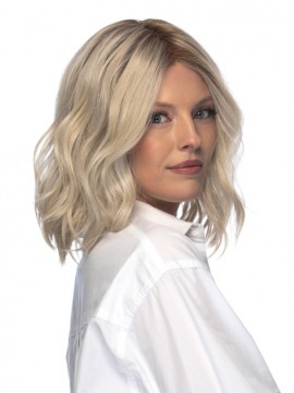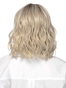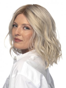 This is Somers Wig by Estetica. Machine Made with a mono crown. A gorgeous mid length style with wispy bangs and loose waves. Effortlessly stylish, just pop it on and go! Our recommendation for styling Heat Friendly fiber is to stay between 275° F-300° F for best results.