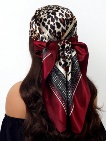 Beautiful fashionable silk feel scarf/bandana in a fun and popular leopard print pattern with burgundy and balck trim.