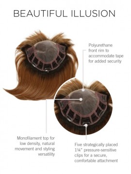 This modern top piece blends in with your own hair to create a look that’s perfectly beYOUtiful. Wear for coverage or to change up your look. Adding a professionally cut bang is now as simple as 1, 2, 3. To attach, simply clip in the perimeter pressure-sensitive clips, finger style and go! Your dream do is now a dream come true.
